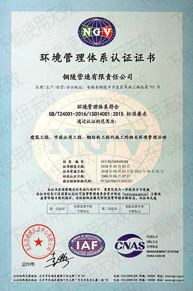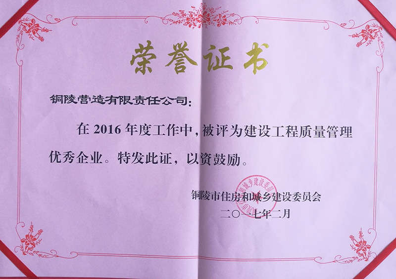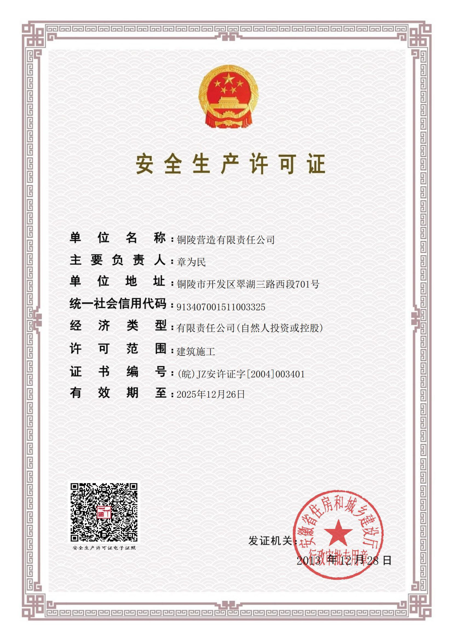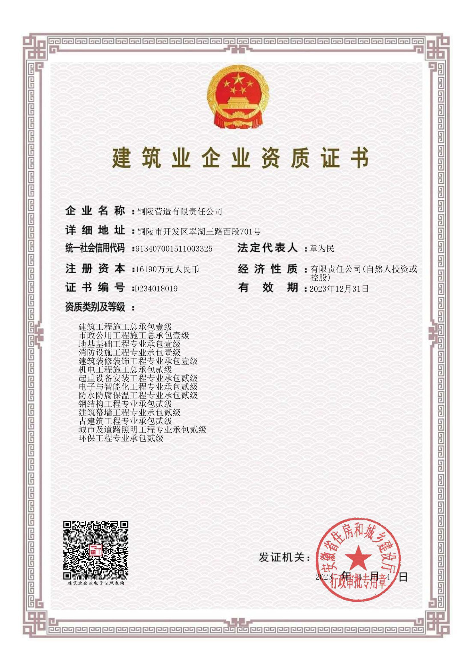 銅陵?duì)I造有限責(zé)任公司是國(guó)家住建部核準(zhǔn)的房屋建筑總承包一級(jí)企業(yè)。2006年7月,企業(yè)二次改制為民營(yíng)企業(yè),并更名為“銅陵?duì)I造有限責(zé)任公司”。目前,公司擁有房建施工總承包、市政公用工程總承包、鋼結(jié)構(gòu)專業(yè)工程承包、建筑裝修裝飾專業(yè)工程承包四項(xiàng)壹級(jí)資質(zhì),機(jī)電安裝、起重設(shè)備安裝、建筑幕墻三項(xiàng)貳級(jí)資質(zhì),地基與基礎(chǔ)一項(xiàng)叁級(jí)資質(zhì)。2008年通過北京恩格威ISO9001、ISO14001和OHSAS18001“三合一”體系認(rèn)證。